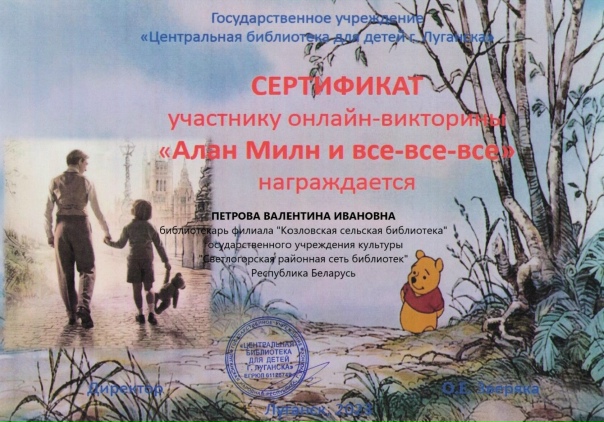 Библиотекарь Козловской сельской библиотеки приняла участие в онлайн акциях и викторинах, организованных Российскими коллегами и получила сертификаты.